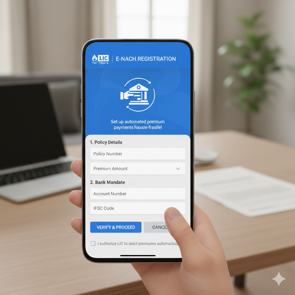 LIC e-NACH allows automatic premium deduction directly from your bank account. It ensures timely premium payment, avoids policy lapse, and removes the worry of due dates. Once registered, premiums are debited automatically, providing convenience, continuity, and peace of mind.
